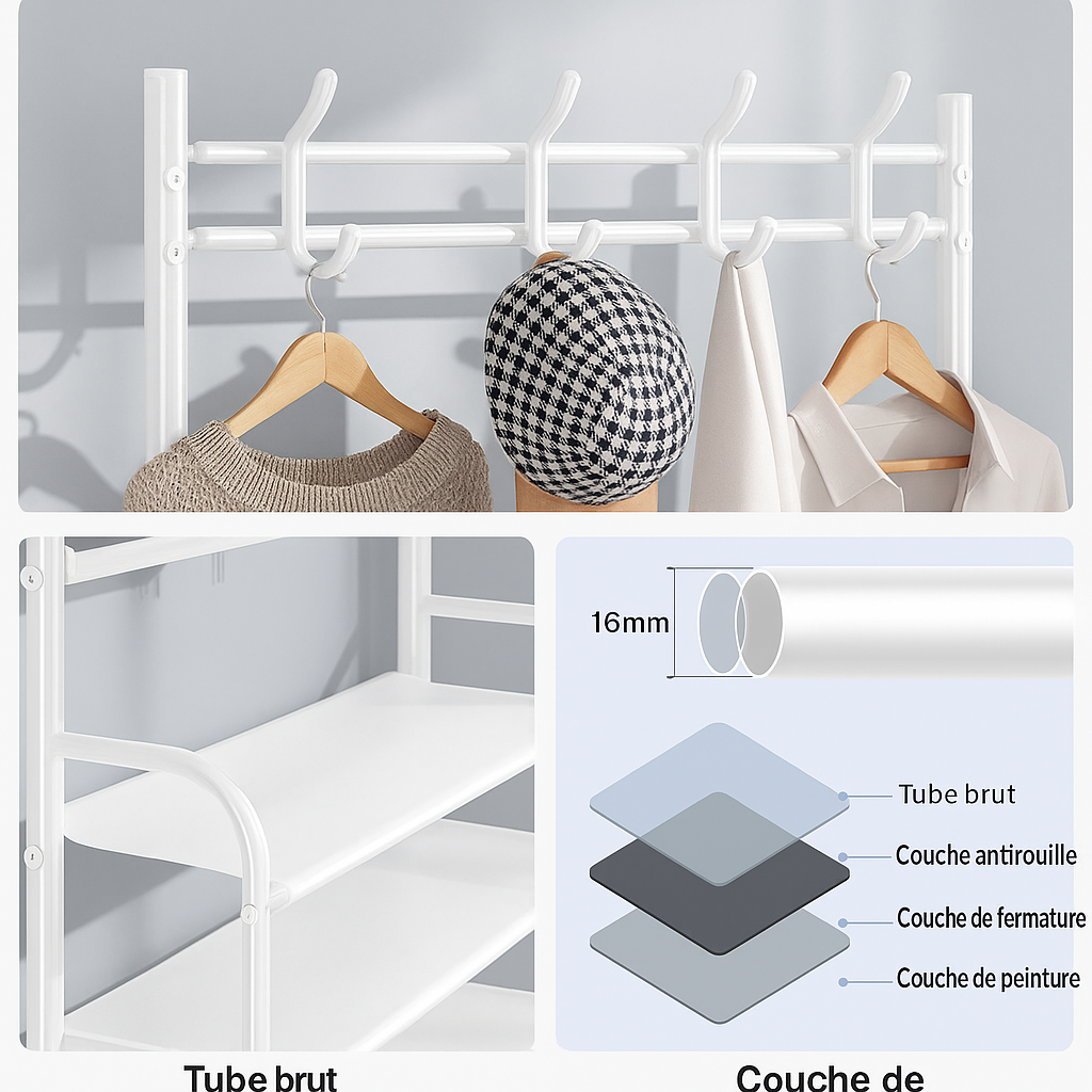 Fabriqué en métal durable, ce meuble résiste à la déformation et à la corrosion. Sa finition lisse et poudrée protège vos vêtements des accrocs. Chaque crochet supporte jusqu’à 1 kg (2,2 lbs) et reste sécurisé avec ses bords arrondis anti-rayures.