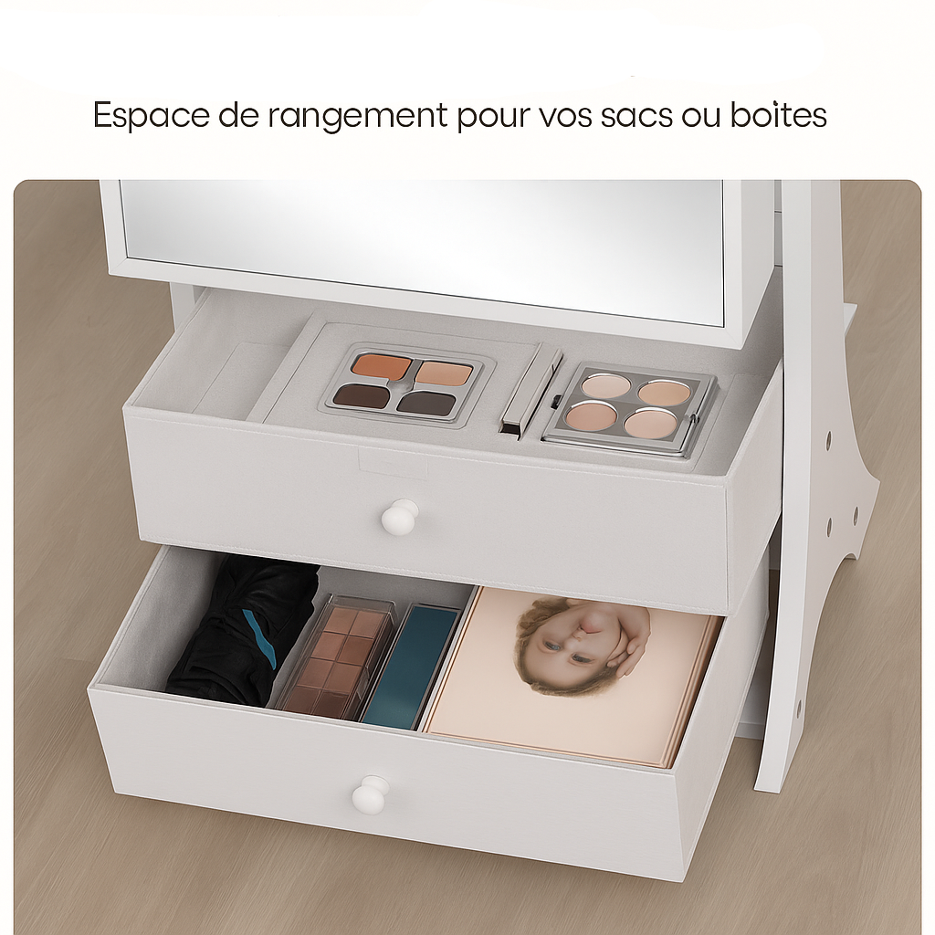 En plus du miroir et du rangement bijoux, profitez d’un tiroir inférieur pratique et d'une étagère supplémentaire pour y déposer vos sacs, accessoires, ou même des chaussures. Une fonctionnalité discrète et astucieuse pensée pour gagner de l’espace sans rien sacrifier à l’élégance.
