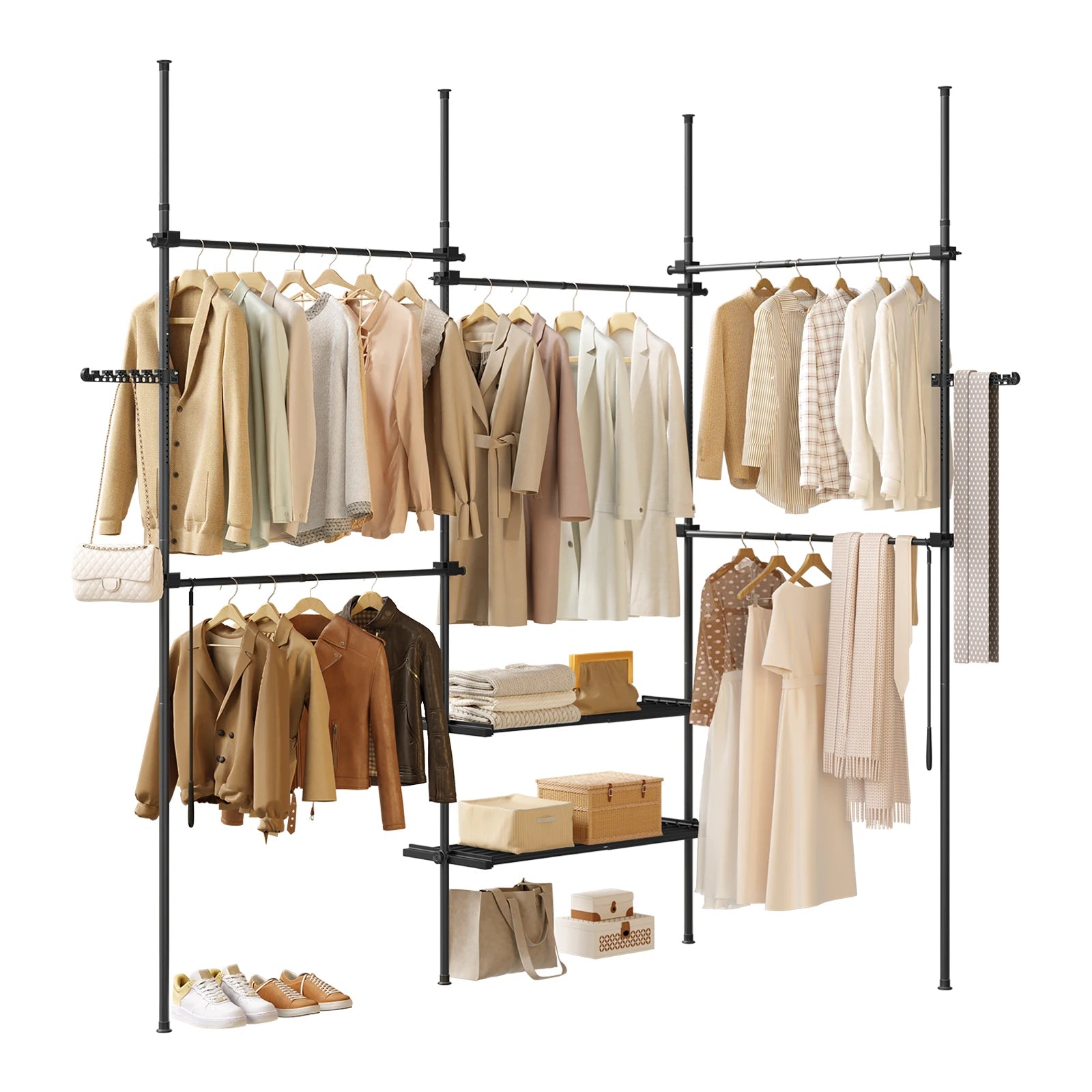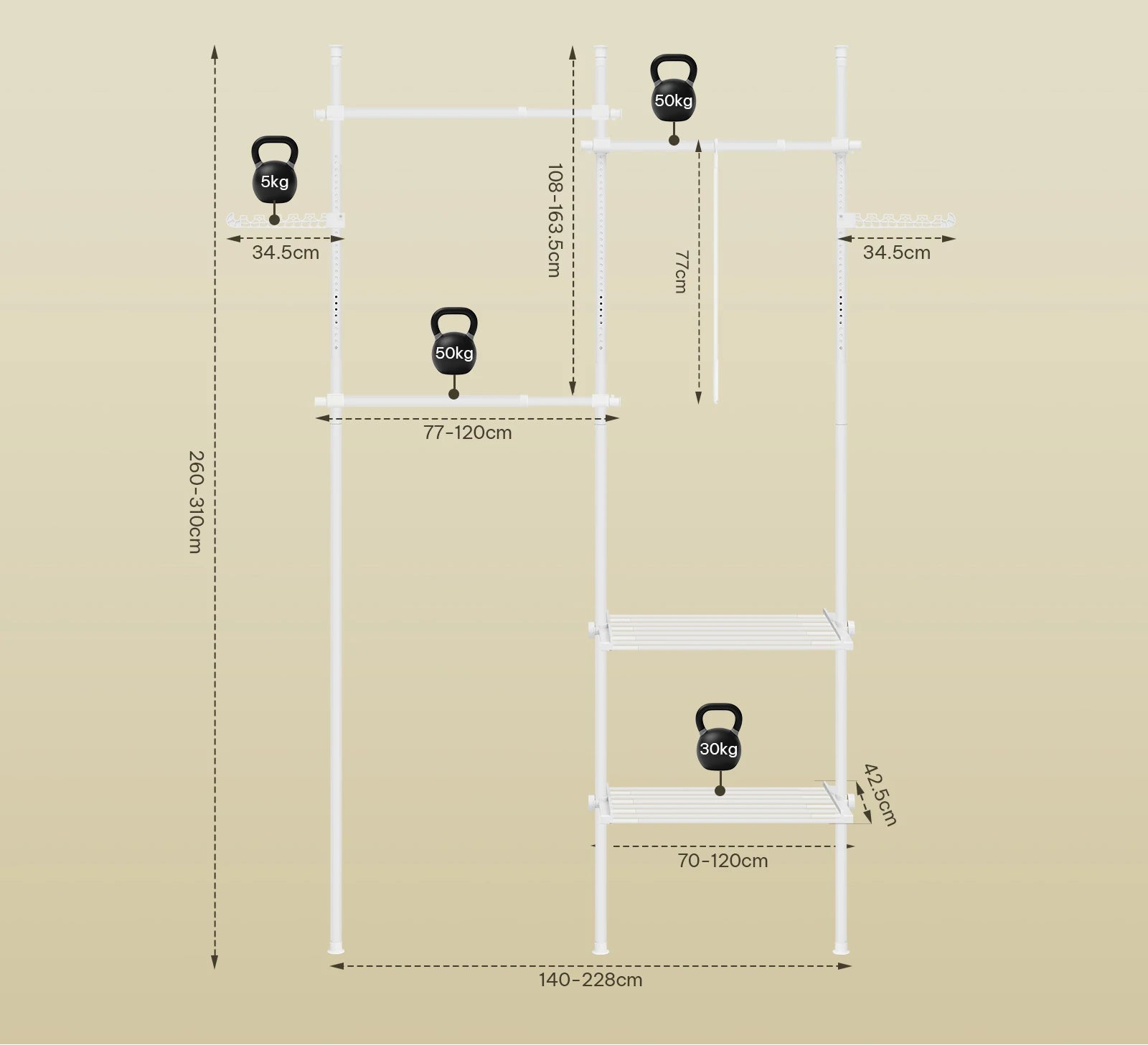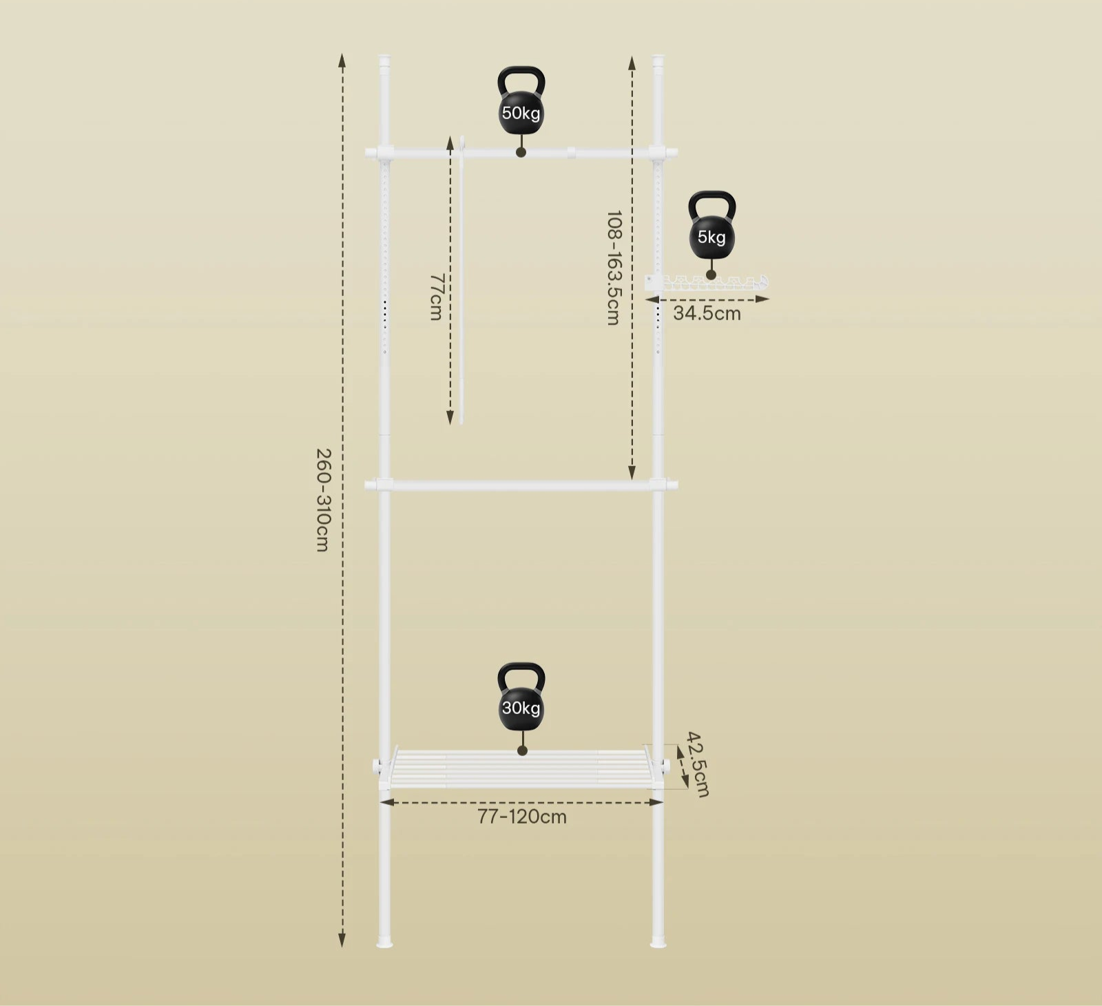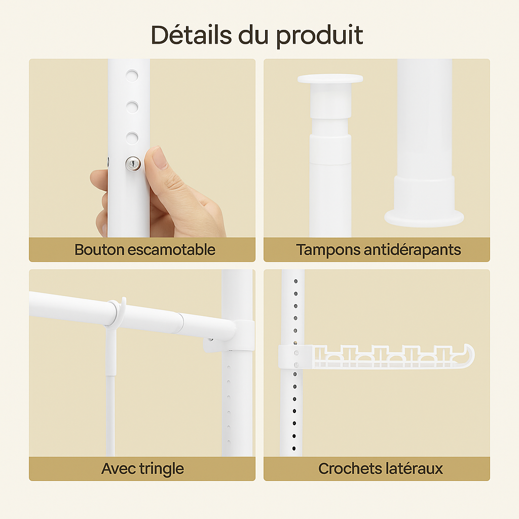 Chaque barre supporte jusqu’à 50 kg, les étagères jusqu’à 30 kg, et les crochets latéraux 5 kg. De quoi suspendre vos vêtements, sacs ou paniers de rangement en toute sécurité. La conception en métal et plastique renforcé garantit une excellente durabilité.