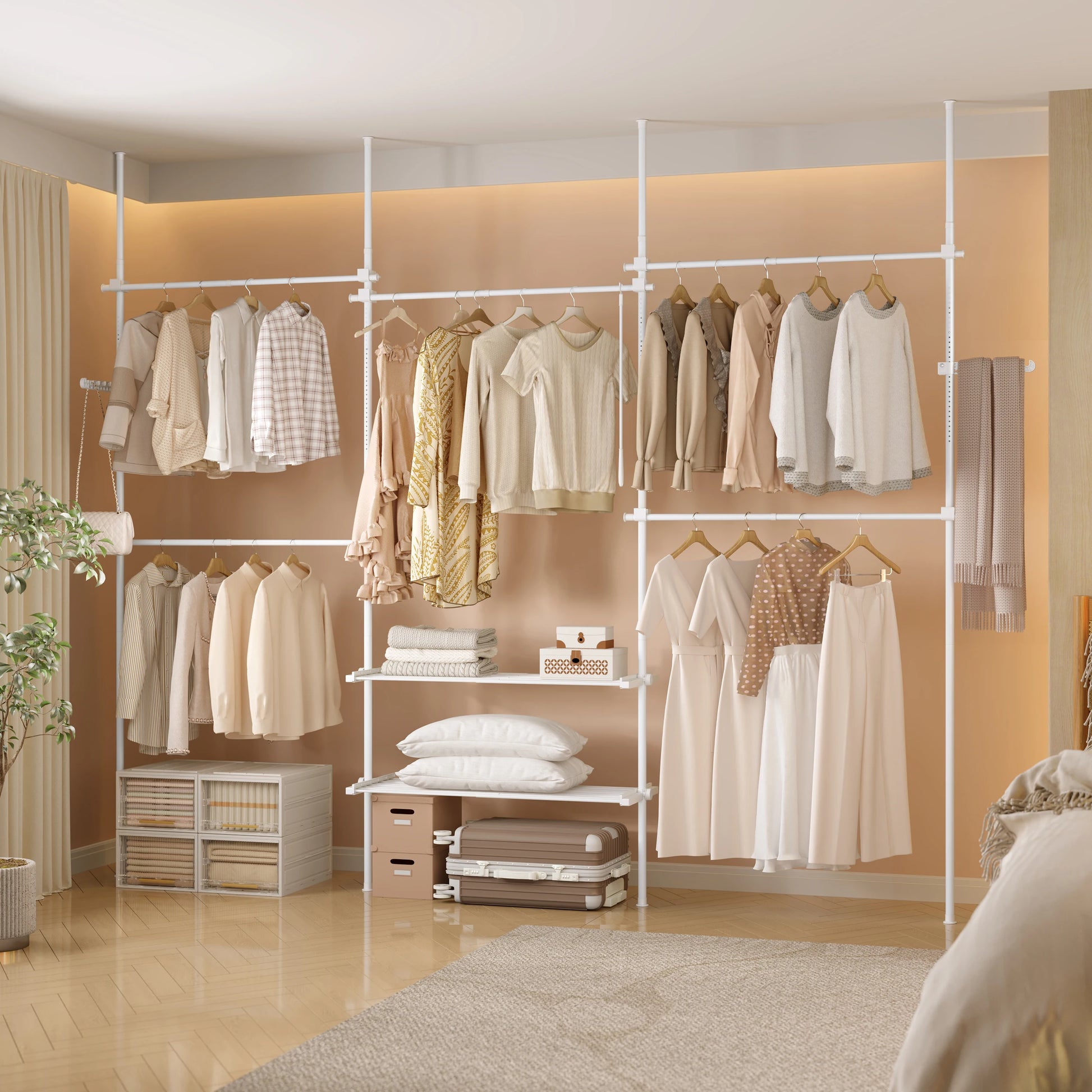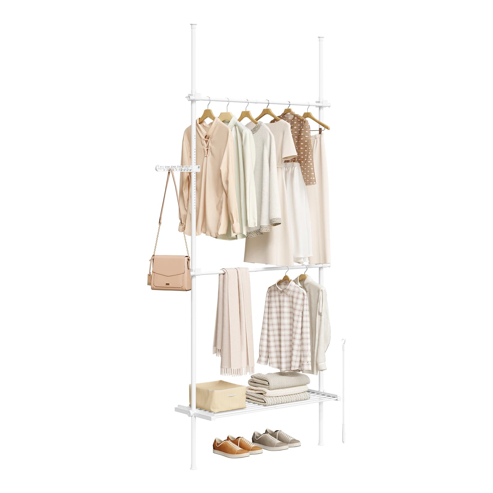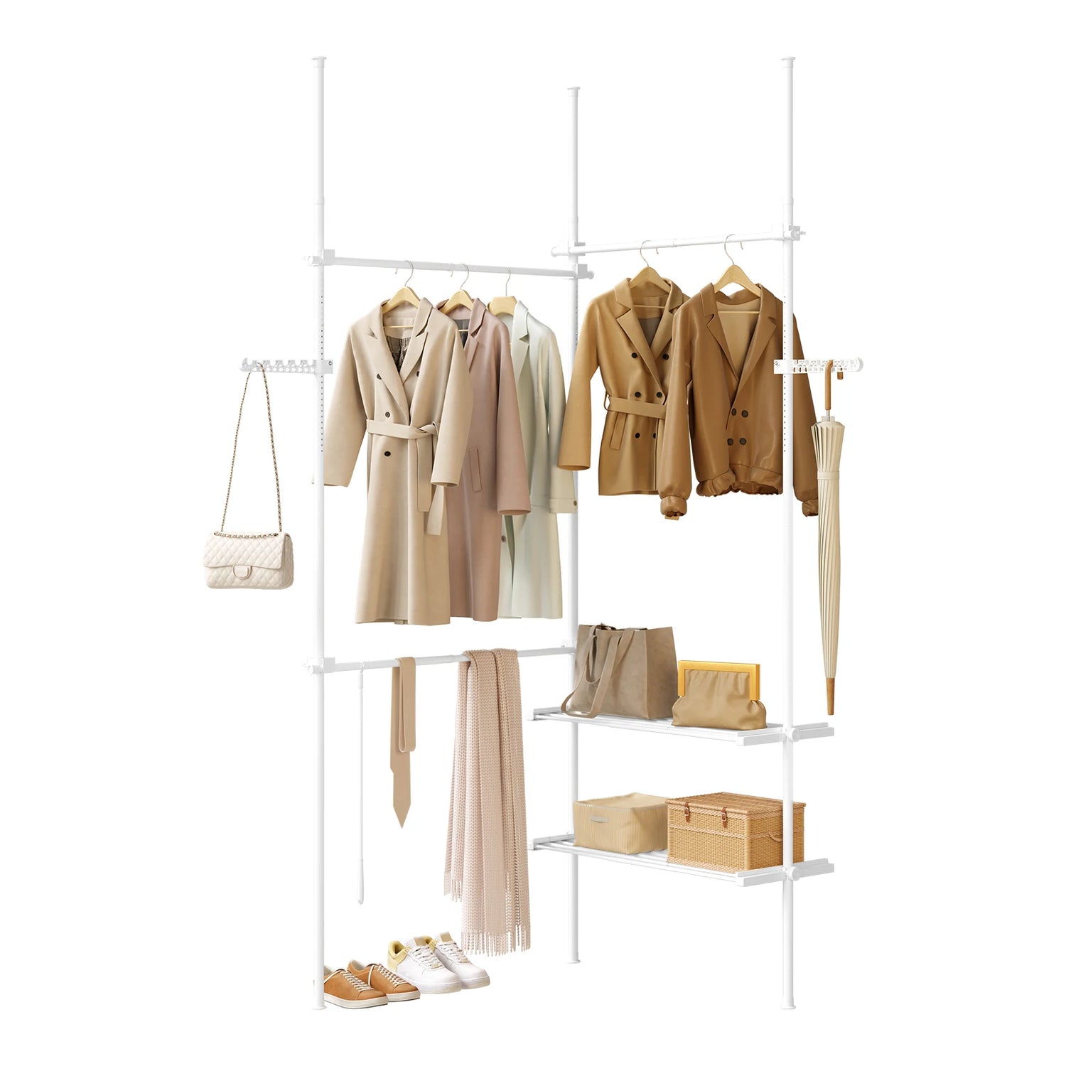Chaque barre supporte jusqu’à 50 kg, les étagères jusqu’à 30 kg, et les crochets latéraux 5 kg. De quoi suspendre vos vêtements, sacs ou paniers de rangement en toute sécurité. La conception en métal et plastique renforcé garantit une excellente durabilité.
