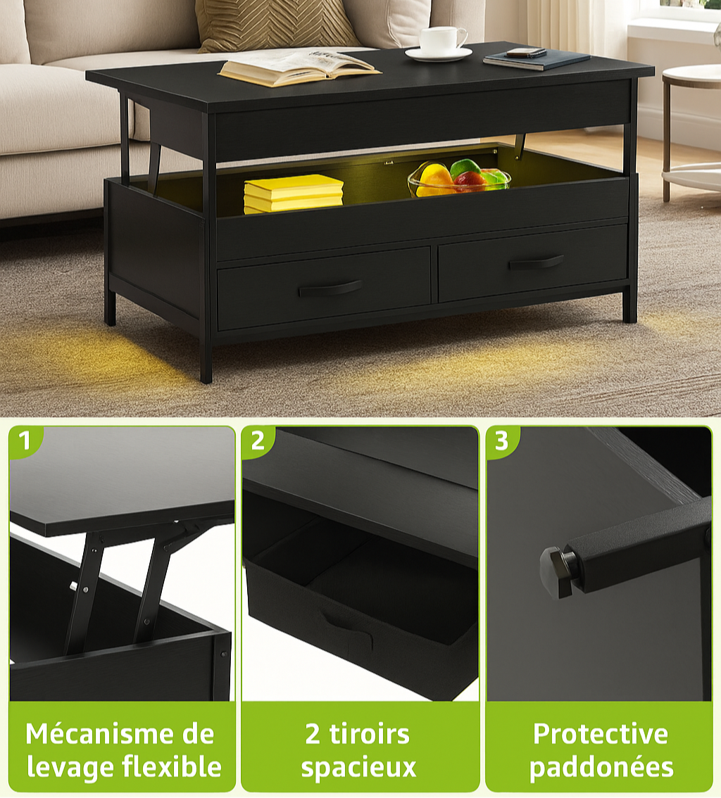 Son plateau double fonction s’adapte à tous les moments de vie : Une moitié se relève pour écrire, télétravailler ou manger au canapé. L’autre moitié se tire et s’abaisse, créant un accès facile aux compartiments cachés. Avec ses dimensions généreuses (106 × 50 × 51,5 cm), cette table offre un véritable confort multifonction dans les petits salons.