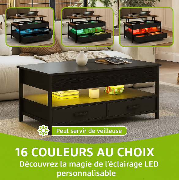 Un bandeau LED intégré sous le plateau offre 16 couleurs au choix, contrôlables par télécommande ou application. Créez l’atmosphère qui vous ressemble : lumière douce pour une soirée cocooning, blanche pour télétravailler, ou colorée pour une ambiance moderne et design.